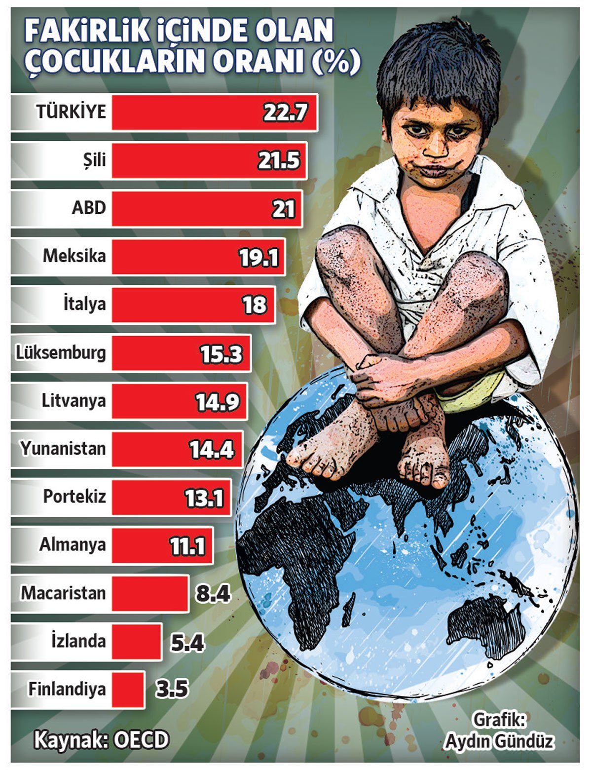 Son dönemde çok hızlı artan yoksullaşma Türkiye’de önce en hassas durumdaki çocukları vuruyor. Türkiye bugün yüzde 22.7’lik oranla çocukların en yoksul olduğu Ekonomik İş birliği ve Kalkınma Teşkilatı (OECD) üyesi ülke. Dünya Bankası tahminlerine göre gıda enflasyonundaki her 1 puanlık artış, dünya genelinde derin yoksul sayısını 10 milyon kişi artırıyor. Türk-İş verilerine göre mart itibarıyla son bir yılda Türkiye’de gıda fiyatlarının yüzde 76.4 arttığı dikkate alındığında durumun vahameti ortaya çıkıyor.
