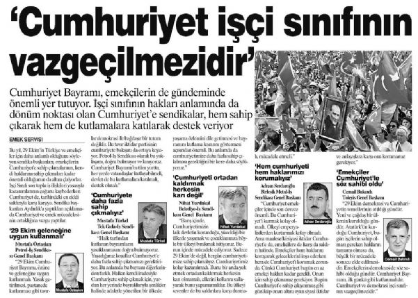 "29 Ekim demokrasi ve Cumhuriyetin temellerinin atıldığı gündür. Yeni ve çağdaş bir ülkenin kurulduğu gündür. Atatürk’ün kurduğu Cumhuriyet, bugün işçilerin sahip olması gereken haklann tamamı olmasa da, büyük bir mücadele sonucu elde edilmesidir. Emekçilerin demokraside söz sahibi olduğu gündür. Cumhuriyet Bayramı, ilk günkü gibi kutlanmalıdır. Cumhuriyet ve demokrasi işçi sınıfının vazgeçilmezidir."