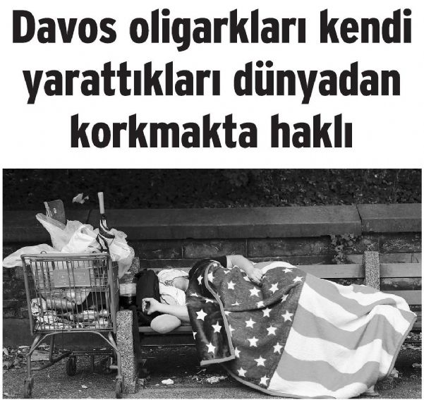 Davos Zirvesi’nde buluşan milyarderler ve kurumsal oligarklar eşitsizlik konusunda endişelilermiş. Bu insanlar, insanlık tarihindeki en büyük ekonomik eşitsizliği yaratan sistemin yöneticileri. Artık kriz tarafından istila edilmiş ekonomik düzenin mimarları da kendi yarattıkları tehlikenin farkında.