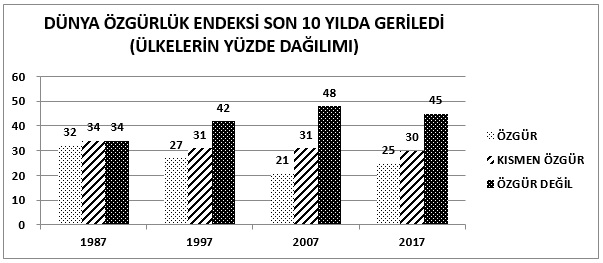 1987 yılında dünyadaki ülkelerin yüzde 34’ü özgür ülke statüsünde iken, 2007 yılında bu oran yüzde 48’ e yükseldi. Yani 20 yıl demokrasi kazandı. 2007 yılından sonra özgür ülke oranı yüzde 48’den 2017 yılında yüzde 45’e geriledi. Aynı on yılda özgür olmayan ülkeler oranı da yüzde 21’den, yüzde 25’e yükseldi.