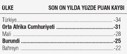 Yine Freedom House 2018 raporunda, son on yılda Dünyada insan hakları ve demokratik özgürlükler açısından toplam puan olarak en fazla kaybeden ülkeler tespit ediliyor. Dünyada demokraside en fazla kan kaybeden ülke Türkiye oldu.