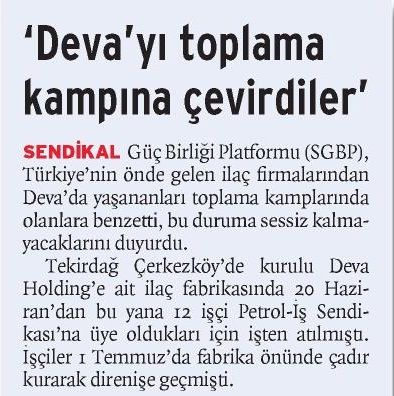 SENDİKAL Güç Birliği Platformu (SGBP), Türkiye´nin önde gelen ilaç firmalarından Deva´da yaşananları toplama kamplarında olanlara benzetti, bu duruma sessiz kalmayacaklarını duyurdu.