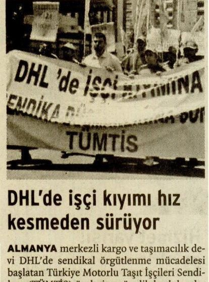 ALMANYA merkezli kargo ve taşımacılık devi DHL´de sendikal örgütlenme mücadelesi başlatan Türkiye Motorlu Taşıt İşçileri Sendikası (TÜMTİS) üyelerine yönelik baskılar devam ediyor. Sendikaya üye oldukları için 4 işçinin işten atılmasının ardından geçtiğimiz Cuma günü, DHL´nin Esenyurt-Kıraç´ta bulunan depolarında çalışan 5 işçi daha işten atıldı.