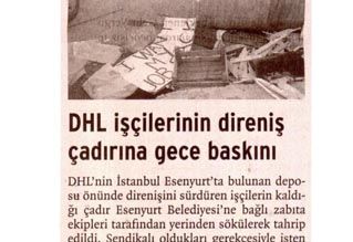 DHL´nin İstanbul Esenyurt´ta bulunan deposu önünde direnişini sürdüren işçilerin kaldığı çadır Esenyurt Belediyesi´ne bağlı zabıta ekipleri tarafından yerinden sökülerek tahrip edildi. Sendikalı oldukları gerekçesiyle işten atılan DHL işçileri, 214 gündür burada direnişini sürdürüyordu.