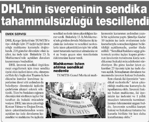 DHL Kargo Şirketi´nin TÜMTİS´e üye olduğu için 25 işçiyi işçiyi işten attığı mahkeme kararıyla doğrulandı. 218 gündür direnişte olan işçiler, işe iade için Bakırköy 13. İş Mahkemesi´nde açtıkları davaları kazanmaya başladılar.