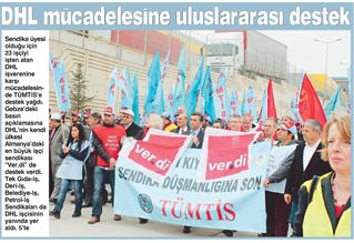 Sendika üyesi olduğu için 23 işçiyi işten atan DHL işverenine karşı mücadelesinde TÜMTİS´e destek yağdı. Gebze´deki basın açıklamasına DHL´nin kendi ülkesi Almanya´daki en büyük işçi I sendikası Ver.di de destek verdi. Tekgıda-İş, I Deri-İş, I Belediye-İş, Petrol-İş Sendikaları da DHL işçisinin I yanında yer aldı.