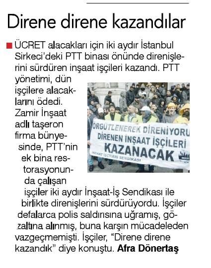 PTT yönetimi, dün işçilere alacaklarını ödedi. Zamir inşaat adlı taşeron firma bünyesinde, PTT’nin ek bina restorasyonunda çalışan işçiler iki aydır inşaat-iş Sendikası ile birlikte direnişlerini sürdürüyordu, işçiler defalarca polis saldırısına uğramış, gözaltına alınmış, buna karşın mücadeleden vazgeçmemişti, işçiler, "Direne direne kazandık" diye konuştu.
