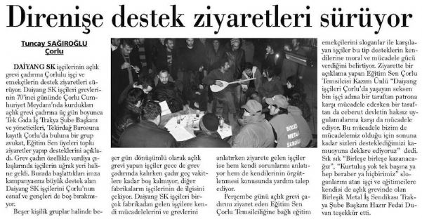 DAİYANG SK işçilerinin açlık grevi çadırına Çorlulu işçi ve emekçilerin destek ziyaretleri sürüyor. Daiyang SK işçileri grevlerinin 70´inci gününde Çorlu Cumhuriyet Meydanı´nda kurduklan açlık grevi çadınna üç gün boyunca Tek Gıda iş Trakya Şube Başkanı ve yöneticileri, Tekirdağ Barosuna kayıtlı Çorlu´da buluna bir grup avukat, Eğitim Sen üyeleri toplu ziyaretler yapıp desteklerini açıkladı.
