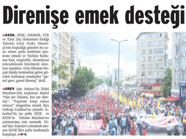 KESK, DİSK, TMMOB, TTB ve Türk Diş Hekimleri Birliği Taksim Gezi Parkı Direnişi´nin başladığı günden bu yana süren polis terörünü protesto etmek ve Türkiye halkının hak, özgürlük, demokrasi mücadelesini büyüterek alanlara taşıdılar.