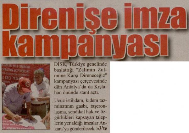 DİSK, Türkiye genelinde başlattığı "Zalimin Zulmüne Karşı Direneceğiz" kampanyası çerçevesinde Antalya’da da stant açtı. Kışlanan önündeki stantta hafta sonuna kadar toplanacak imzalar, daha sonra Ankara’ya gönderilecek. İmza kampanyasına ilişkin yapılan basın açıklamasına KESK’e bağlı sendikaların şube başkanları, CHP İl Başkanı Devrim Kök, CHP Muratpaşa İlçe Başkanı Ercan Erkan, Atatürkçü Düşünce Demeği Başkanı İbrahim Daş ve bazı sivil toplum kuruluşu üyeleri destek verdi. Grup adına açıklamayı yapan DİSK Akdeniz Bölge Temsilcisi Matoş Konca, "AKP iktidannın emekçilere dünyayı dar eden politikalarına ve güvencesizliğe işsizliğe karşıyız" diye konuştu.