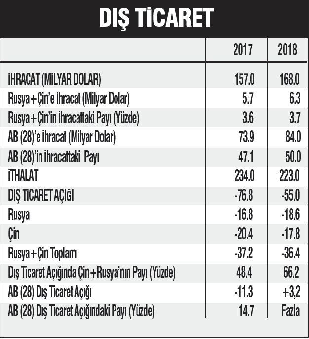 Son yıllardaki dış politika uygulaması da, Türkiye için dış ticarette kayıplara neden oluyor. Söz gelimi 2018 yılında ihracatımızın yarısını Avrupa Birliği (28) ile yaptık ve Avrupa’ya dış ticaret fazlası verdik. Buna karşılık ihracatımızın yalnızca yüzde 3.7’sini Rusya ve Çin’e yaptık ve fakat dış ticaret açığımızın yüzde 66.2’sini bu iki ülkeye verdik.