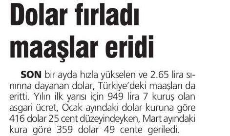 SON bir ayda hızla yükselen ve 2.65 lira sınırına dayanan dolar, Türkiye´deki maaşları da eritti. Yılın ilk yarısı için 949 lira 7 kuruş olan asgari ücret, Ocak ayındaki dolar kuruna göre 416 dolar 25 cent düzeyindeyken, Mart ayındaki kura göre 359 dolar 49 cente geriledi.