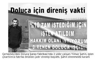 Çerkezköy´deki Doluca Şarap Fabrikası´nda 3 yıldır çalışan Yılmaz Şahin, işten çıkartılınca fabrika önünde çadır direnişi başlattı. Şahin direnmekte kararlı.