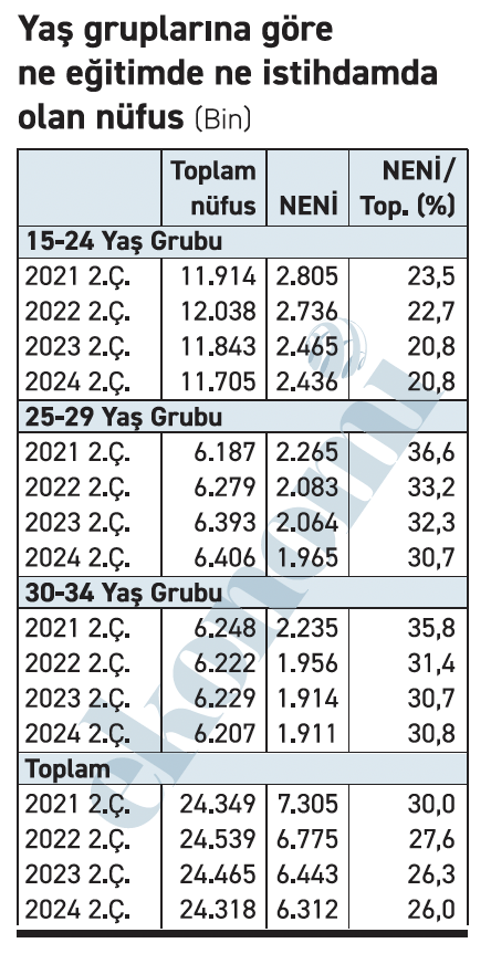 TÜİK, 15-34 yaş arası nüfusu genç nüfus olarak niteliyor. Buna göre bu yaş grubundaki nüfus 2024’ün ikinci çeyreğinde 24.3 milyon düzeyinde ve bu nüfusun 6.3 milyonu ne eğitimde ne istihdamda. Oran yüzde 26.