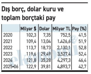 Maliye Bakanlığı’nın önceki gün açıkladığı haziran sonu verilerine göre Hazine’nin dış borç stoku 122,9 milyar dolar. Hazine’nin aynı tarihteki iç borç stoku ise 6,6 trilyon lira.
