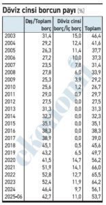 Dolayısıyla Hazine’nin toplam borcunun yüzde 53,7’si döviz cinsinden oluşuyor.