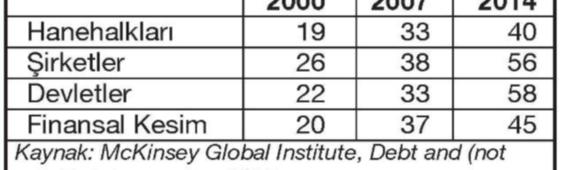 2000’den başlayarak 2014’e değin hane halklarının borçları 21 trilyon, finans dışı şirketlerin 30 trilyon, devletlerin 38 trilyon, finansal şirketlerin (bankalar) 25 trilyon dolar artmış durumda.