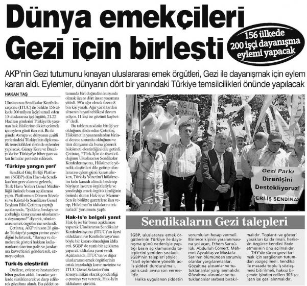 Uluslararası Sendikalar Konfederasyonu (ITUC) ile birlikte 156 ülkede 200 milyon işçiyi temsil eden 10 uluslararası işçi örgütü, 21-22 Haziran günlerini Türkiye’de yaşanan hak ihlallerine dikket çekmek için eylem günü ilan etti. Bu iki günde Avrupa ve dünyanın çeşitli yerlerindeki Türkiye’nin diplomatik temsilcilikleri önünde eylemler yapılacak. Güney Kore ve Brezilya’da ise Türkiye’ye biber gazı satan firmalar protesto edilecek.