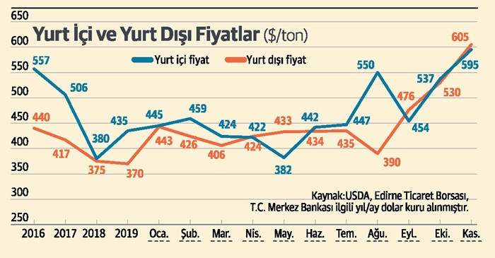Ayçiçeği fiyatlarına bakınca, 2020 Mayıs, Haziran ve Temmuz aylarında tonu 434 dolar seviyesinde olan yurt dışı fiyatları Eylül’de 476 dolara, Ekim’de 530 dolara ve Kasım’da ise 605 dolara kadar yükseldi. Türkiye’deki fiyatlar ise, dolar bazında 2020 Mayıs ayında 382 dolar ile en düşük seviyedeyken, Haziran’da 442, Temmuz’da 447 dolara çıkarken Ağustos’ta 550 dolara yükseldi. Aralık ayında ise 644 dolara yükseldi. Şu anda ayçiçeğinin tonu 720-730 dolara, ham ayçiçeği yağı ise 1340-1350 dolara Türkiye teslimi ithal ediliyor. Dünya fiyatları artarken Türkiye’de de fiyatlar artıyor. Eğer yeterli üretiminiz yoksa ithalat yapmak zorundaysanız böyle dönemlerde ithalat pahalı olunca iç piyasa fiyatlarını da kontrol etmeniz mümkün olmuyor. Hatta, paranız olsa bile ürün yoksa alamıyorsunuz. Bu nedenle yıllardır kendine yeterliliğin ne kadar önemli olduğunu, ülkenin tarım potansiyelini değerlendirmenin ne kadar değerli olduğunu anlatmaya çalışıyoruz.