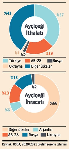 Üretim azalırken, yüksek talep ve tüketimdeki artış dünyada olduğu gibi Türkiye’de de ayçiçeği fiyatlarının artmasında en önemli faktör görülüyor. Türkiye’nin ürettiği ayçiçeği, ülke ihtiyacının ancak yüzde 64’ünü karşılıyor. Yüzde 36’sı ithal ediliyor. İthal edilen ayçiçeği tohumu veya ham yağın bir bölümü de işlenerek ihraç ediliyor. Tarım ve Orman Bakanlığı’nın söz konusu raporunda Amerika Tarım Bakanlığı verilerine dayanılarak yayınlanan grafiğe göre, Ayçiçeği ithalatında Türkiye yüzde 37 pay ile açık ara ilk sırada. Dünya ayçiçeği ithalatının yüzde 37’sini Türkiye, yüzde 19’unu Avrupa Birliği’nin 28 ülkesi gerçekleştiriyor. İhracatta ise Rusya yüzde 13 ile ilk sırada, Avrupa Birliği 28 ülkesinin toplam ihracatı da yine yüzde 13 seviyesinde. Arjantin’in payı yüzde 6, Ukrayna’nın yüzde 2 seviyesinde.