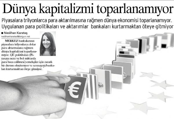 MERKEZ bankalarının piyasalara trilyonlarca dolar para aktarmasına rağmen dünya kapitalizmi toparlanamıyor. QE politikaları (Piyasaya ucuz ve bol miktarda para boca edilmesi) emekçiler için zararlı bir durum oluşturuyor ve sermayeyi/bankaları kurtarmaktan öteye gitmiyor.