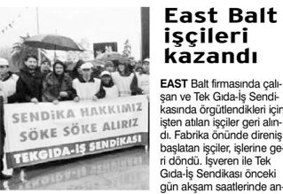 East Balt işçileri kazandı East Balt firmasında çalışan ve Tekgıda-İş Sendikasında örgütlendikleri için işten atılan işçiler geri alındı.