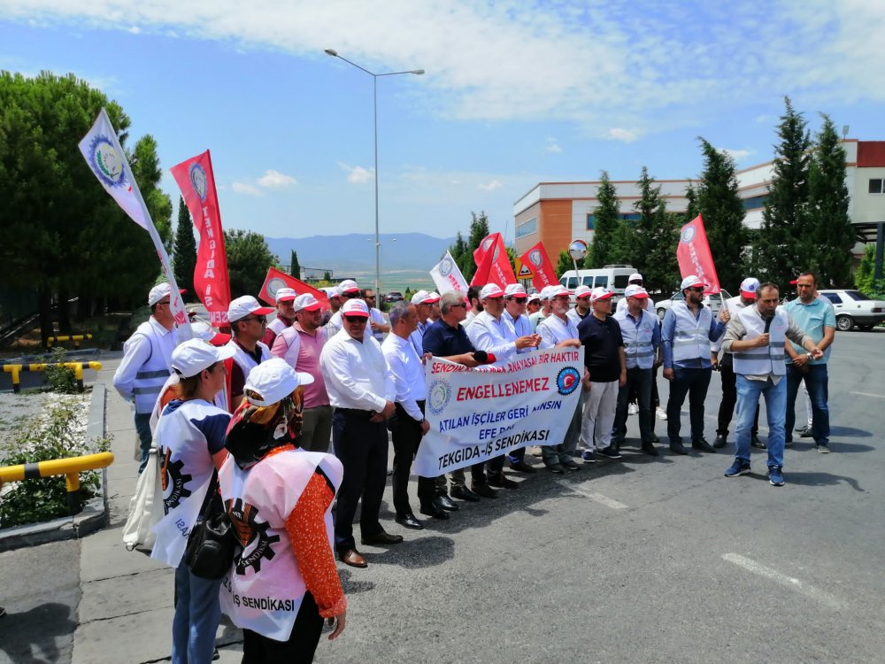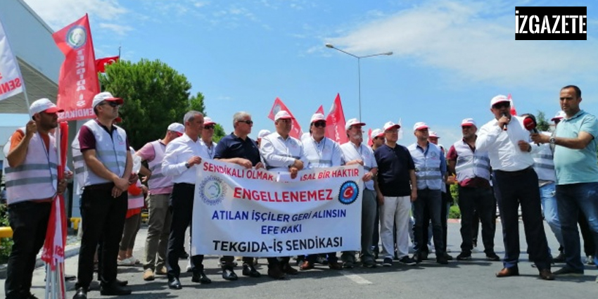 Sendikaya üye oldukları için işten atılan 24 Efe Rakı işçisi için fabrika önünde basın açıklaması yapan Tekgıda-İş, “İşten çıkartılan işçileri bir an önce işbaşı yaptırmanızı istiyoruz” dedi. Açıklamaya Türk-İş Ege Bölge Temsilcisi, Türk Metal İzmir Şube Başkanı, Demiryol-İş İzmir Şube Başkanı, Tekgıda-İş 3 ve 7 No’lu şube yöneticileri, örgütlenme uzmanları, atılan işçiler ve Öz Gıda-İş üyesi işçiler de katıldı. Sık sık “Atılan işçiler geri alınsın”, “Yaşasın sınıf dayanışması”, “Anayasal hakkımız engellenemez”, “Birleşen işçiler asla yenilmez” sloganları atılırken açıklamayı Tekgıda-İş 7 No’lu Şube Başkanı Ömer Atabey okudu.