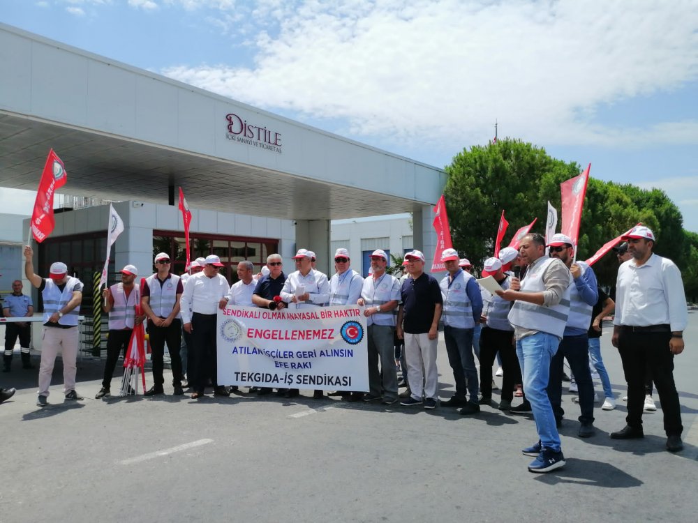 İzmir Menderes’te faaliyet gösteren 150 işçinin çalıştığı Distile (Efe Rakı) fabrikasında 24 işçi Tekgıda-İş Sendikasına üye oldukları için işten çıkarıldı. İşçiler fabrika önünde basın açıklaması yaptı.