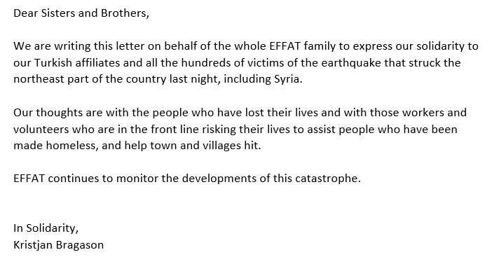 Bu mektubu tüm EFFAT ailesi adına, Türkiye’deki üyelerimiz ve Suriye de dahil olmak üzere 6 Şubat gecesi ülkenin kuzeydoğusunda meydana gelen depremde hayatını kaybeden yüzlerce mağdurla dayanışmamızı ifade etmek için yazıyoruz.