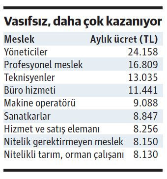 2022 yılında meslek gruplarına göre yapılan değerlendirmede en yüksek aylık ücreti 24 bin 158 lire ile yöneticiler alırken, profesyonel meslek mensupları 16 bin 809 lira, teknisyenler 13 bin 35 lira aylık gelir elde ettiler. Bu kategoride en düşük ücret 8 bin 150 lira ile nitelik gerektirmeyen mesleklerde, 9 bin 88 lira ile tesis ve makine operatörlerinde ve 8 bin 847 lira ile de sanatkarlarda gözlendi. Türkiye’de en çok aranılan meslek gruplarından olan nitelikli tarım işçiliğinde ise kazançların taleple doğru orantılı olmaması dikkat çekti. Bu meslek grubunda çalışanlar 8 bin 130 lira ile en az gelir elde eden gruplar arasında yer aldılar.