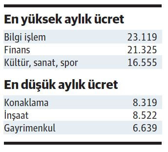 Ekonomik faaliyetlere göre en yüksek aylık ortalama maaş 23 bin 119 lira ile bilgi iletişim sektörlerinde olurken, bunu 21 bin 325 lira ile finans, 16 bin 555 lira ile kültür, sanat, spor faaliyetleri takip etti.