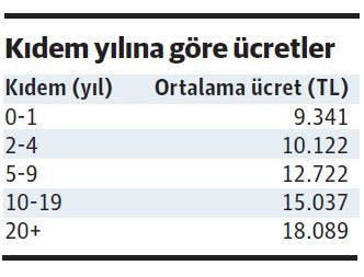 Kıdem yılına göre ücretlerde, işe yeni girenlerin aylık ücreti 9 bin 341 lira olurken, 20 ve üzeri yıllık kıdemi bulunanların aylık ortalama ücretinin 18 bin 089 lira olduğu gözlendi. Yani 20 yıl ve üzerinde çalışan birisi, işe yeni girenin iki katı ücret alıyor.