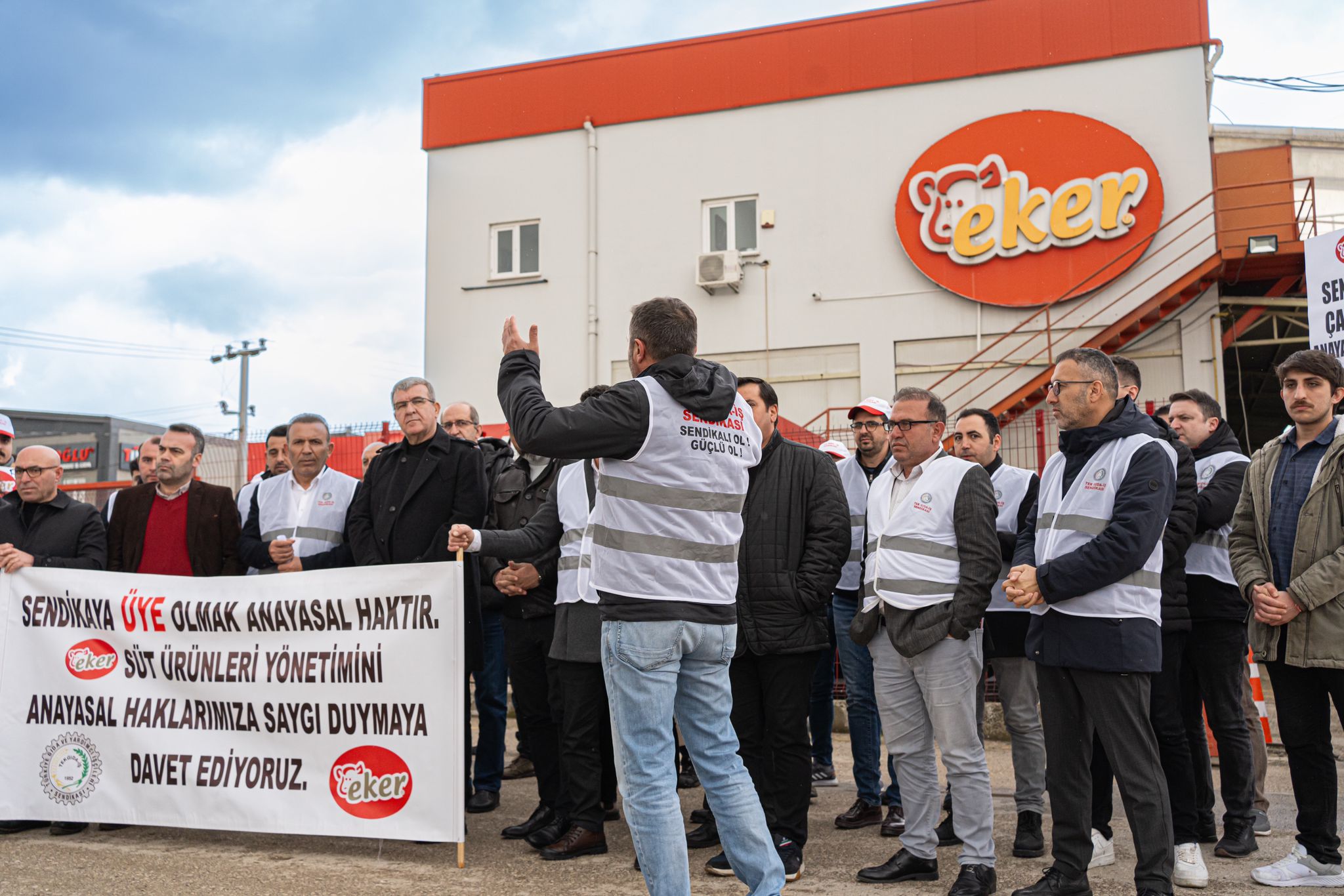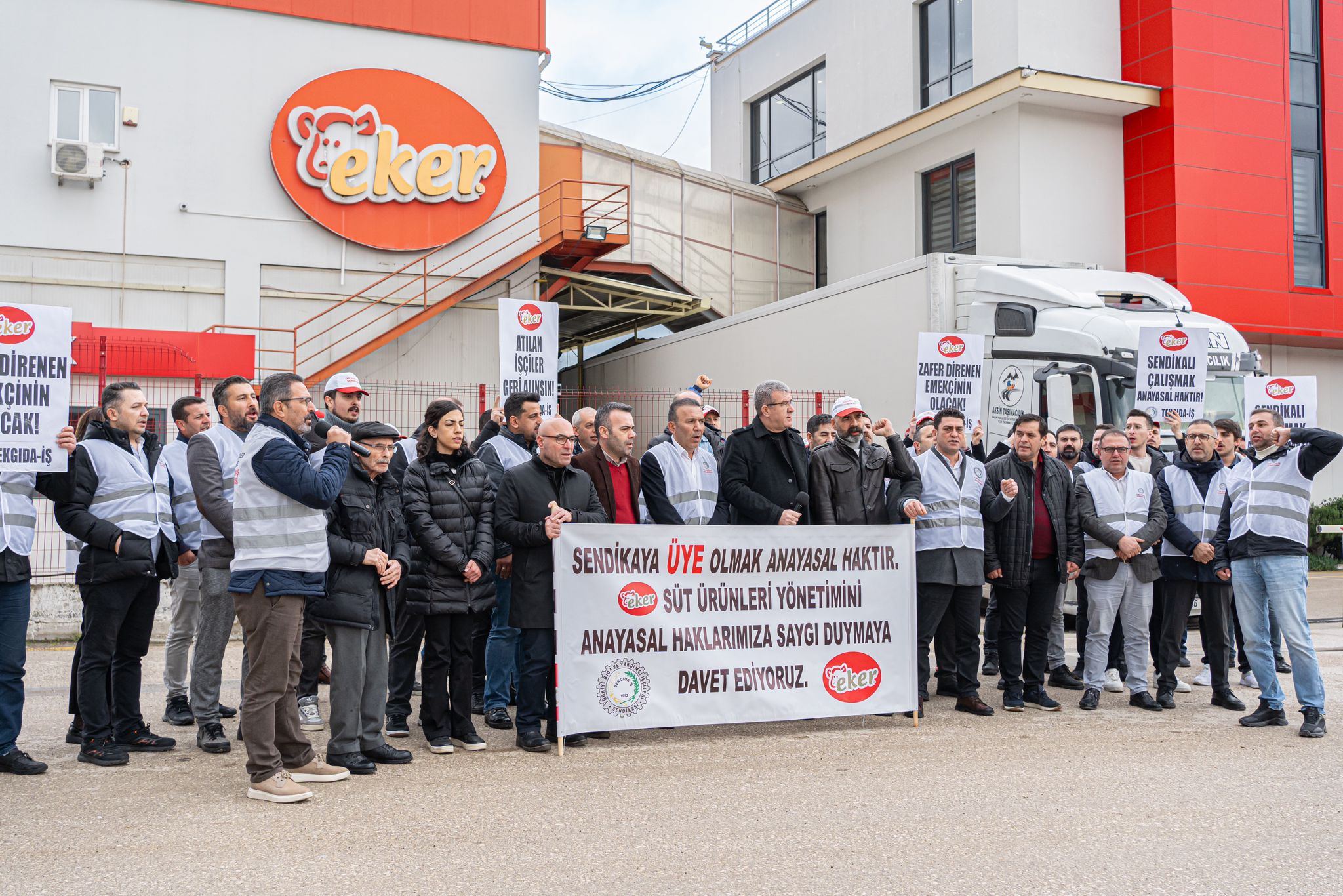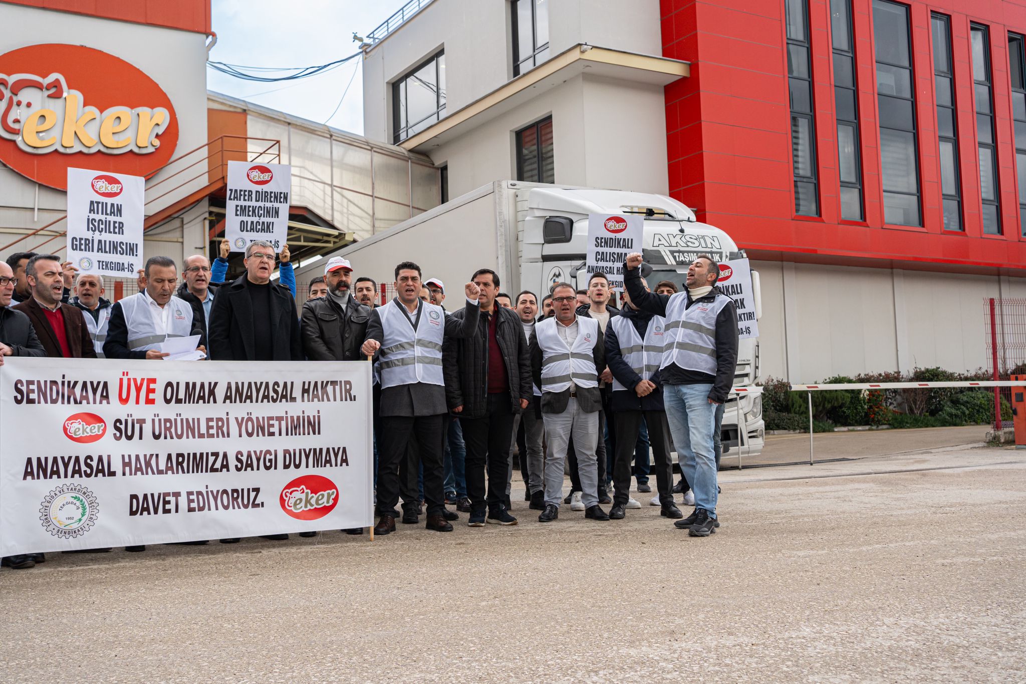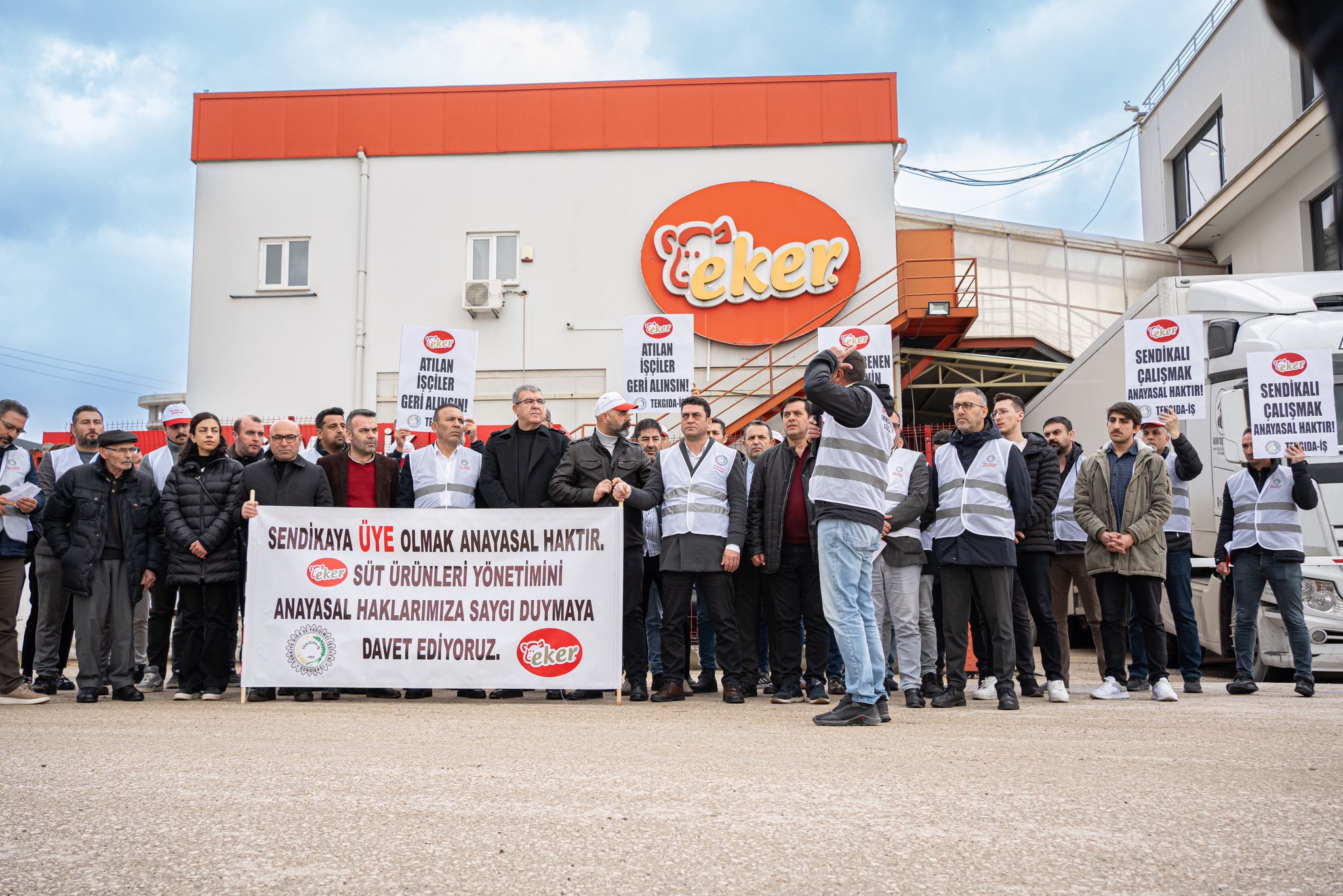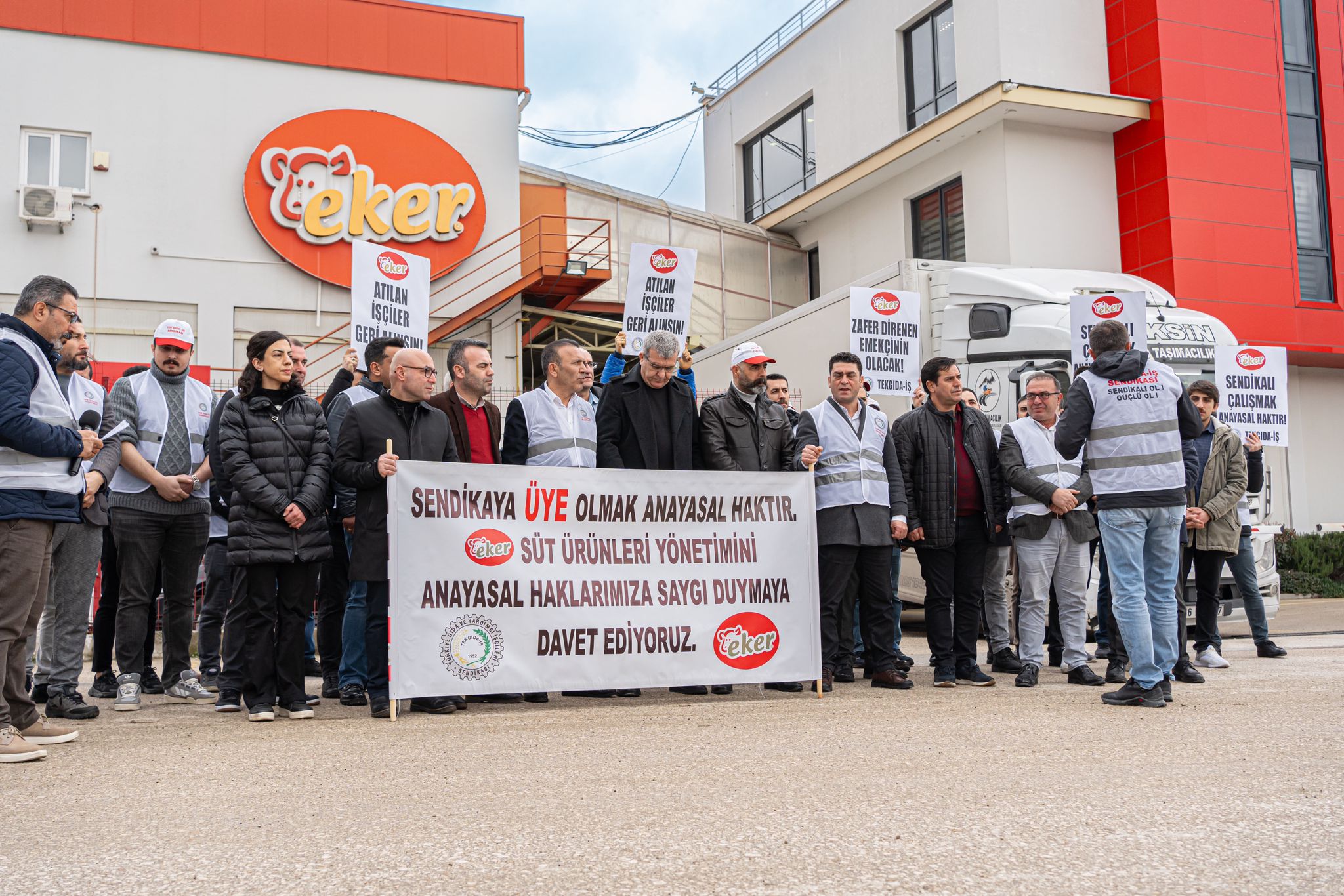 Açıklamada şu ifadelere yer verildi: “Yaklaşık 1.900 çalışanı bulunan Eker Süt yöneticilerinin yaptıkları bu baskıcı uygulamalardan bir an önce vazgeçmesini istiyoruz. Çalışanların sendikaya üye olmaları güvence altına alınmıştır. Bugün burada bu basın açıklamasını yapmamızın amacı şirket patronlarının bu baskılardan haberi yok ve depo yöneticilerinin bireysel işgüzarlıklarından kaynaklanan bir baskı varsa bu işgüzar yöneticilerin bir an önce uyarılması ve çalışanlara sendika üyeliğinin işçinin kendi tercihi olduğuna dair her çalışana mail gönderilmesini talep ediyoruz. Eğer bu baskılar direkt patronların talimatıyla yapılıyorsa bundan bir an önce vazgeçilmesini istiyoruz. Sendika üyesi olduğu için işçiyi işten atamazsınız. İşten çıkarılan tüm arkadaşlarımızın işe iadelerinin bir an önce gerçekleşmesini istiyoruz.”