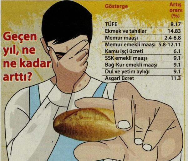 En temel gıda maddesi olan ekmeğin fiyatı, son bir yıl içerisinde yüzde 14.83 oranında arttı. Sayıları 19 milyona ulaşan memur, emekli, asgari ücretli, dul, yetim hatta sendikalı işçiden hiç birinin maaş zammı ekmek zammına yaklaşamadı.