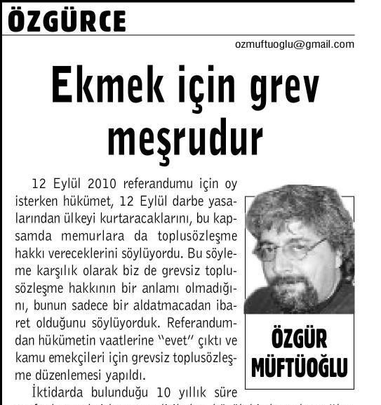 12 Eylül 2010 referandumu için oy isterken hükümet, 12 Eylül darbe yasalarından ülkeyi kurtaracaklarını, bu kapsamda memurlara da toplusözleşme hakkı vereceklerini söylüyordu. Bu söyleme karşılık olarak biz de grevsiz toplusözleşme hakkının bir anlamı olmadığını, bunun sadece bir aldatmacadan ibaret olduğunu söylüyorduk.