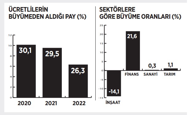 Ancak geçen yıllara göre emeğin aldığı pay oldukça düşük seviyede kalmaya devam ediyor. Emek kesiminin milli gelirden aldığı pay geçen yılın üçüncü çeyreğine göre 3,5 puan geriledi ve yüzde 26,3’e indi. Bu oran 2020 yılında yüzde 30,1’di.