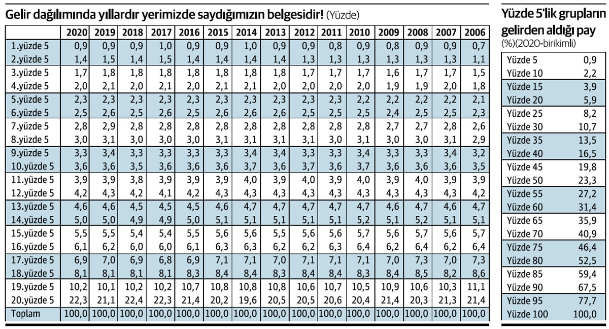TÜİK dün 2020 sonuçlarını açıkladı. Önceki yıllara göre pek bir fark yok. Gelirin nasıl dağıldığına bakıyoruz; doğrusu bu alanda pek istikrarlıyız, gelir dağılımı çarpıklığı yıllardır aynı şekilde sürüyor. Birkaç örnek verelim: