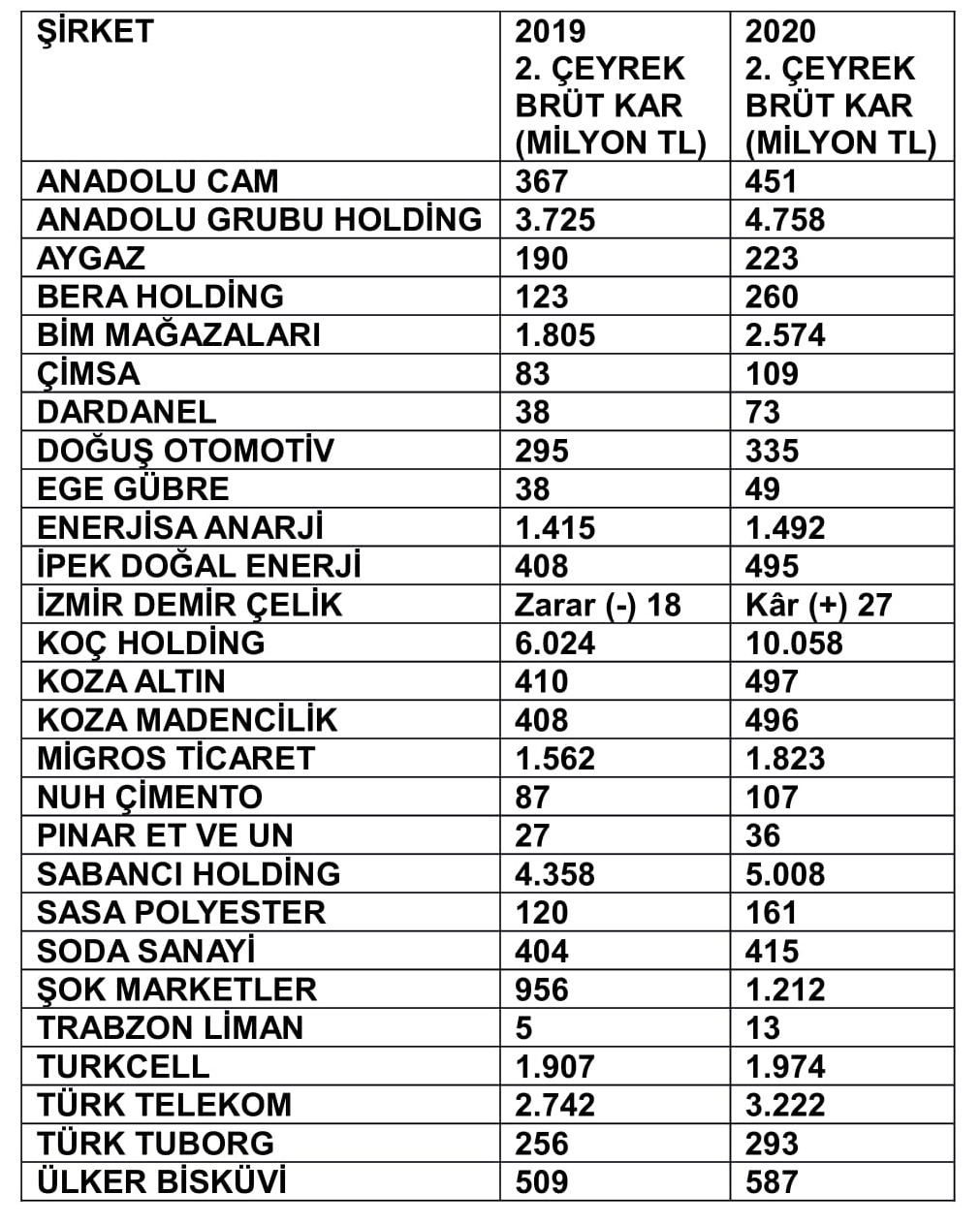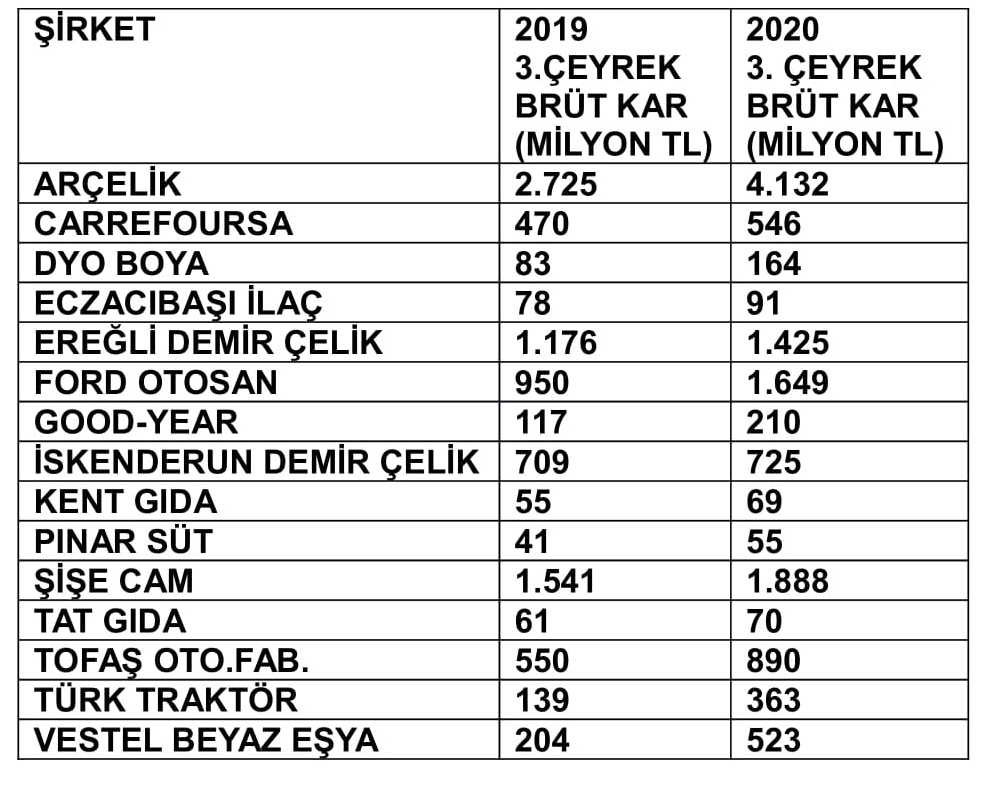 Bu dönemde zarar eden şirketler de var; ancak bazı şirketlerin artan kârları dikkat çekiyor. Aşağıda bu şirketlerden bazılarını sunuyorum. İşler zorlaştığında öncelikle kimin fedakarlıkta bulunması gerektiğine siz karar verin.
