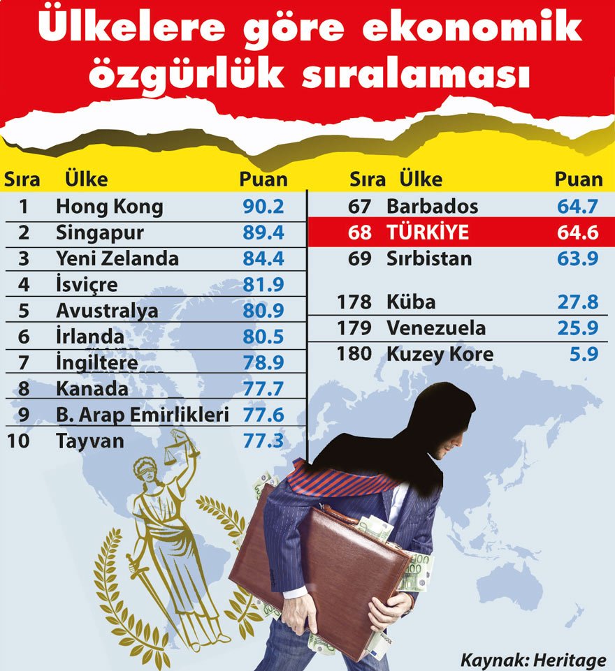 Ülkelerin uyguladığı politikalarla ekonomik özgürlüğü hangi oranda desteklediğini gösteren Ekonomik Özgürlük Endeksi’nin 2019 raporunda Türkiye 180 ülke arasında 68’inci oldu. “Orta derecede serbest” kategorisinde yer alan Türkiye’yi Ruanda, Endonezya, Kosta Rika, Jamaika ve Romanya gibi ülkeler geçti. 2018 endeksine göre 10 sıra birden gerileyen Türkiye ayrıca Avrupa bölgesindeki 44 ülke arasında 33’üncü oldu. Bir önceki yılın endeksinde Türkiye Avrupa’da 28’inci sıradaydı. Endeks hesaplamalarında 2018’de 65.4 puana sahip olan Türkiye, 2019’da 0.8 puan gerileyerek 64.6 puana indi. Ekonomik Özgürlük Endeksi’nin ilk sırasında ise 90.2 puanla Hong Kong yer aldı. Onun arkasından 89.4 puanla Singapur ve 84.4 puanla Yeni Zelanda geldi. 5.9 puanla da Kuzey Kore endeksin son sırasında yer aldı. Kuzey Kore’nin hemen arkasında son dönemde dünya gündeminden düşmeyen Venezuela, 25.9 puan ile yer aldı. ABD merkezli düşünce kuruluşu Heritage Vakfı’nın her yıl açıkladığı endeksin hesaplamalarında mülk hakları, yargı etkinliği, hükümet faaliyetleri, mevzuat verimlilikleri, iş ve işçi özgürlükleri, parasal özgürlükler, ticaret, yatırım ve finans serbestisi gibi etkenler değerlendirildi.