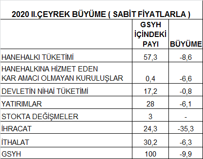 İkinci çeyrekte GSYH’da küçülmeyi, toplam talebin düşmesi ve ihracatın ithalattan daha fazla daralması etkiledi. (Aşağıdaki tablo )