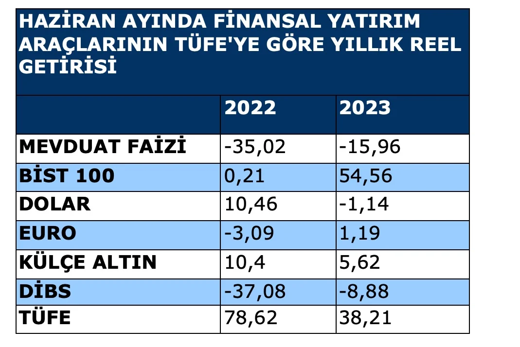 Ancak aynı Haziran ayında yıllık TÜFE oranı yüzde 38,21 olduğu için, mevduatta reel getiri oranı eksi yüzde 15,96 oldu.