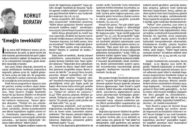 "Türkiye’nin son yıllardaki… seyri, neoliberal İslamcı iktidar bloku eliyle yürütüldü… Dindar-muhafazakarlık neo-liberal kapitalizme bağlılık yemini etti… Esnekleşme, taşeronlaşma,… işsiz bırakmanın kudretini artırma [gibi yöntemler sonunda],… işçi-işveren ilişkilerinde ‘dolaysız kaba sömürü’ hâkim [oldu]".