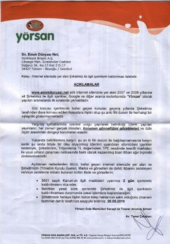 Şimdi Yörsan’ın avukatları, Google gibi arama motorlarında yapılan aramalarda bu haberlerin çıkmasından rahatsızlıklarını belirtip, arşivimizdeki bu haberleri iki gün içinde kaldırmamızı talep ediyor. Yörsan’ın trilyonlarca TL değerindeki marka değerinden bahsedip, bizi ticari itibarlarını zedelemekle itham ediyor. Şirket, eğer bu içerikler kaldırılmazsa hakkımızda yasal işlemlere başvuracağını beyan ediyor.