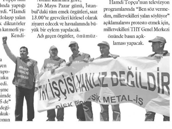 Adı geçen örgütler, önümüzdeki hafta tüm gazetelere Hava-îş Sendikası’nın ve havayolu emekçilerinin yanında olduklarını bildiren tam sayfa ilan verecek. Tüm işyerlerinde 5 dakikayla başlayan bir şekilde geç işbaşı yapma eylemleri yapılacak. Havayolu işçilerine destek çağrısını içeren, ilk etapta 100 bin bildiri dağıtılacak ve afişleme yapılacak. Hamdi Topçu’nun televizyon programlarında "Ben söz vermedim, milletvekilleri yalan söylüyor" açıklamalarını protesto etmek için, milletvekilleri THY Genel Merkezi önünde basın açıklaması yapacak.%