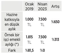 2019 yılında emekli aylıklarında tuhaf bir uygulama başladı. Emekli aylıkları o kadar düştü ki 5510 sayılı Sosyal Sigortalar ve Genel Sağlık Sigortası Kanunu’na eklenen Ek 19’uncu madde ile emekli aylıklarının bin TL’den düşük olamayacağı, düşük olursa aradaki farkın Hazine’den tahsil edileceği hükme bağlandı. Bu miktar Mart 2020’de bin 500 TL, Ocak 2022’de 2 bin 500 TL, Temmuz 2022’de 3 bin 500 TL ve Ocak 2023’te 5 bin 500 TL olarak değiştirildi. Son olarak bu miktar 30 Mart 2023’te TBMM’de kabul edilen 7447 sayılı kanun ile 7 bin 500 TL’ye yükseltildi.
