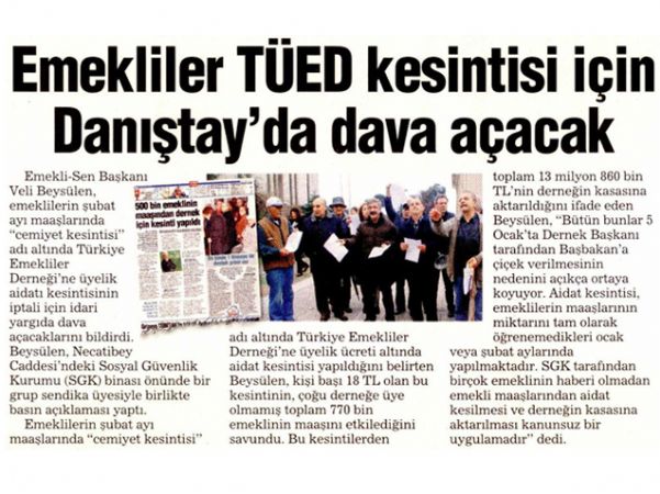 Emekli-Sen Başkanı Veli Beysülen, emeklilerin şubat ayı maaşlarında cemiyet kesintisi adı altında Türkiye Emekliler Derneği´ne üyelik aidatı kesintisinin iptali için idari yargıda dava açacaklarını bildirdi.