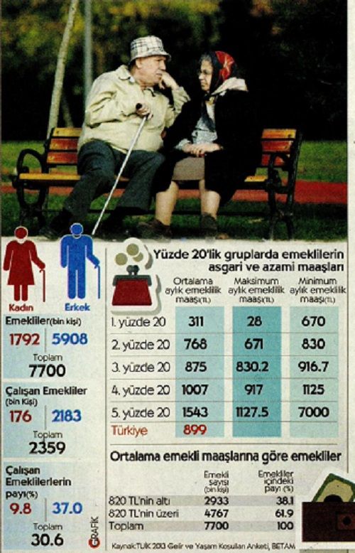 Buna göre en düşük şiddetli maddi yoksunluk oranına sahip bölge yüzde 43.4 ile Batı Anadolu olurken; bu bölgeyi yüzde 45.3 ile Ege ve yüzde 46.2 ile İstanbul takip ediyor. Şiddetli maddi yoksunlukta en yüksek orana sahip bölge ise yüzde 80.5 ile Güneydoğu Anadolu olarak karşımıza çıkıyor. Araştırmada bu yoksulluk oranlarının oldukça yüksek olduğu belirtilirken; bu oranlar aynı zamanda Türkiye’yi Avrupa’da en yüksek şiddetli maddi yoksunluk oranına sahip ülke yapıyor. Araştırmaya göre bunun nedeni ise Avrupa standardının Türkiye için oldukça yüksekte kalması. Örneğin Şiddetli Maddi Yoksunluk oranı Lüksemburg’da yüzde 3’e, Norveç’te yüzde 5’e düşüyor. 1820 TL’nin altı 820 TL’nin üzeri 1 Toplam (bin kişi) 2933 4767 7700 Emekliler içindeki payı (%) 38.1 61.9 100 Çalışan emeklilerin büyük çoğunluğunu erkeklerden oluşturuken; 176 bin çalışan emekli kadına karşılık 2 milyon 183 bin erkek çalışıyor. Araştırmaya göre çalışan kadın emeklilerin yaklaşık üçte ikisi kayıt dışı çalışırken; yaklaşık yüzde 27’si de ücretsiz aile işçisi olarak çalışıyor. Çalışan emekli erkekler ise dörtte üç oranda kayıt dışı çalışıyor ve çalışan erkek emeklilerin yaklaşık yarısı (yüzde 51.9) da kendi hesabına çalışanlardan oluşuyor. Araştırmada ücretli ve maaşlı çalışan erkek emeklilerin payının yüzde 24.7, kadınların payının da yüzde 40.3’ten ibaret olduğunu belirtiliyor.