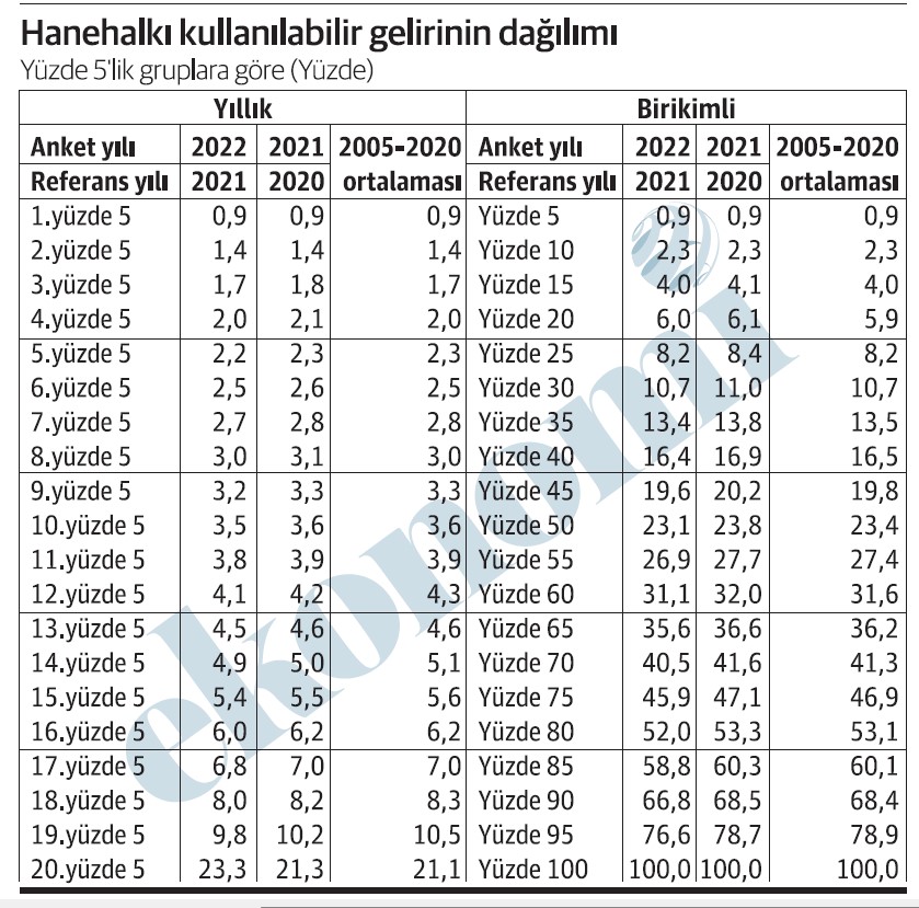 Gelir piramidinin tepesinde yer alan en zengin yüzde 5’lik kesimin gelirden aldığı payda 2005- 2020 döneminin ortalaması yüzde 21.1.2020 yılındaki oran yüzde 21.3. 2021 yılındaki oran ise yüzde 23.3.