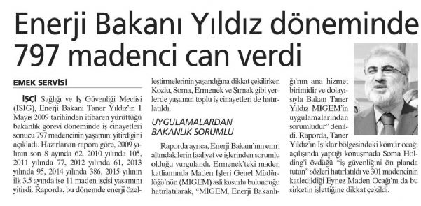 Raporda ayrıca, Enerji Bakanı’nın emri altındakilerin faaliyet ve işlerinden sorumlu olduğu vurgulandı. Ermenek’teki maden katliamında Maden İşleri Genel Müdürlüğü’nün (MİGEM) asli kusurlu bulunduğu hatırlatılarak, "MİGEM, Enerji Bakanlığı’nın ana hizmet birimidir ve dolayısıyla Bakan Taner Yıldız MİGEM’in uygulamalarından sorumludur" denildi.