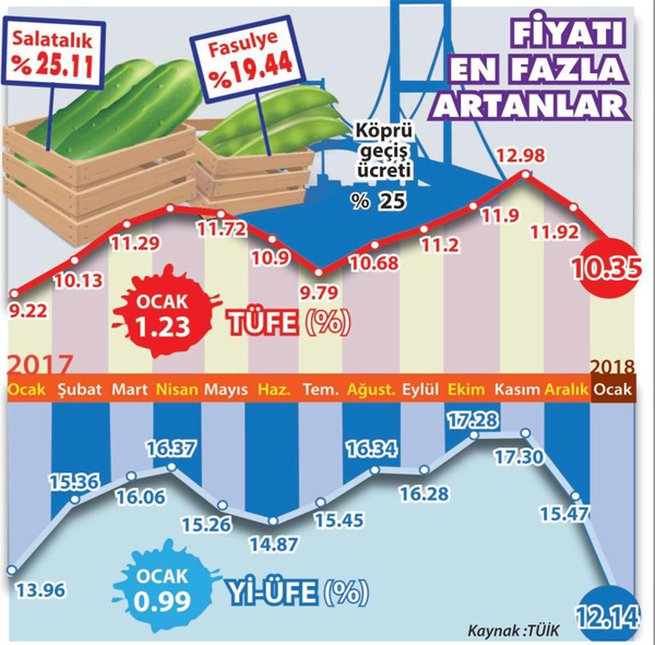 Ocak ayında zam şampiyonu fiyatı yüzde 25.11 artan salatalık olurken, fiyatı yüzde 25 artan köprü geçiş ücreti ikinci, fiyatı yüzde 23.17 artan otoban geçiş ücreti üçüncü sırada yer aldı. Fiyatı en fazla düşen ürün fiyatı yüzde 14 azalan karnabahar oldu. Fiyatı en fazla artanlar sıralamasında, taze fasulye yüzde 19.44, mandalina yüzde 18.81, patlıcan yüzde 15.30, resmi evraklarla ilgili hizmetler yüzde 14.07, magazin ve dergiler yüzde 13.35, nar yüzde 11.14, dolmalık biber yüzde 10.51 aylık artışla öne çıktı. Ocak ayında fiyatı en fazla azalan ürünler sıralamasında ilk sırada yüzde 14.41 düşen karnabahar yer alırken, ikinci sırada fiyatı yüzde 13.94 düşen internet oldu.